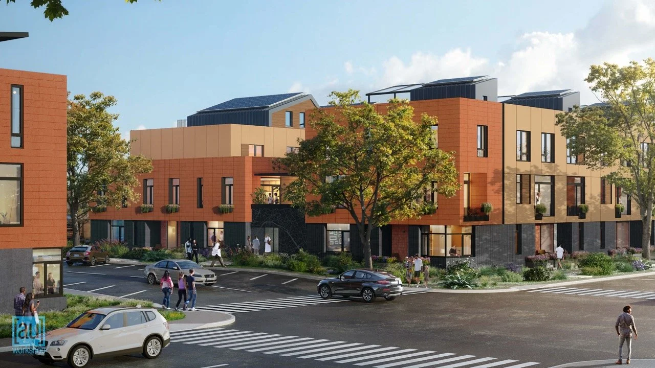 Exterior materials include brick, terracotta, and smooth plaster, all chosen to connect to the scale and texture of adjacent buildings and the neighborhood. Large windows bring light deep into each home.